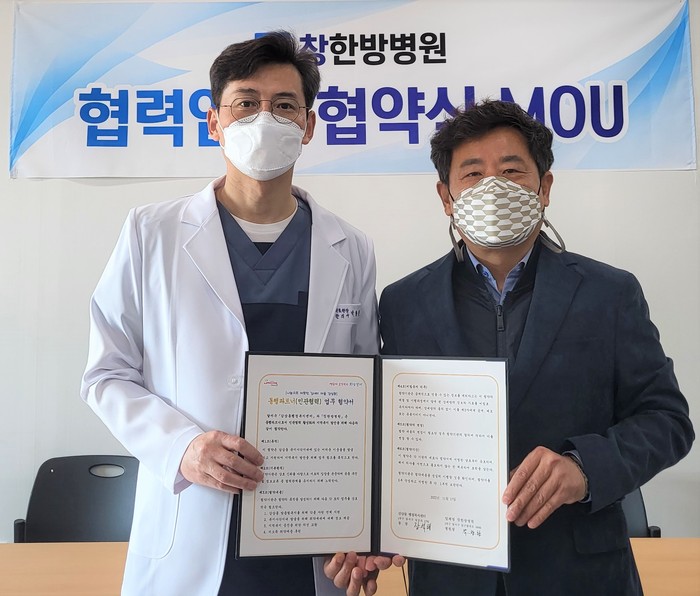 지난 24일 창헌벙병원 박창환 대표 원장과 장석태 감삼동장이 업무협약을 맺고 기념촬영을 하고 있다.(사진=대구달서구)
