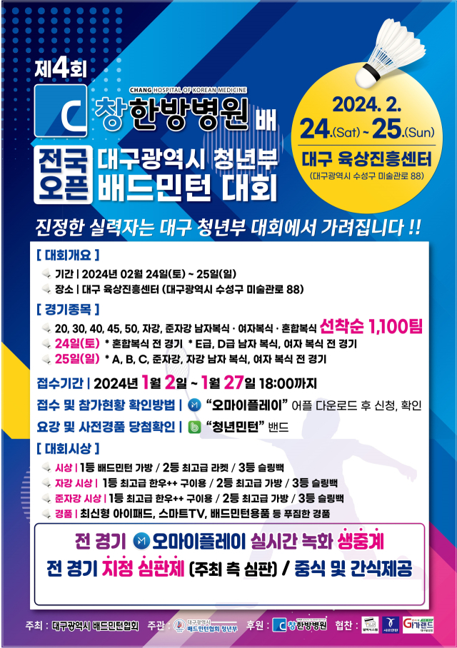 창한방병원이 오는 2024년 2월 24일부터 25일까지 대구육상진흥센터에서 제4회 창한방병원배 청년부 배드민턴 대회를 개최한다고 밝혔다.