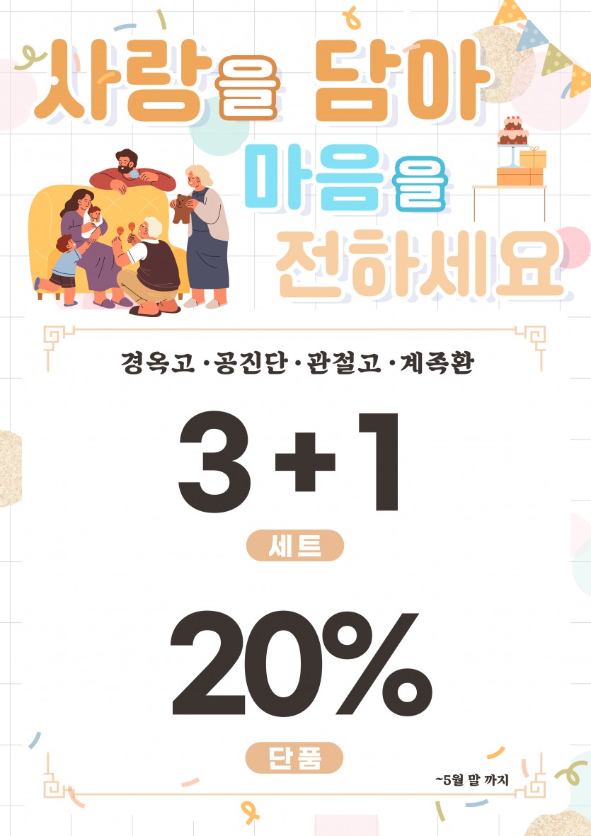 여러분의 마음을 가정의 달에 선물하세요 페이지 정보 작성자 창한방병원 조회 1,535회 작성일 25-04-21 15:41 목록 본문 여러분의 마음을 가정의 달에 선물하세요~ 사랑하는 부모님, 뛰어다니고 공부하는 우리 아들 딸, 존경하는 은사님 , 일하느라 고생하는 아내와 남편 5월엔 그 마음을 표현하세요 이전글2025년 5월 암환우 복지프로그램 안내 25.04.30 다음글2025년 4월 암환우 복지프로그램 안내 25.03.31