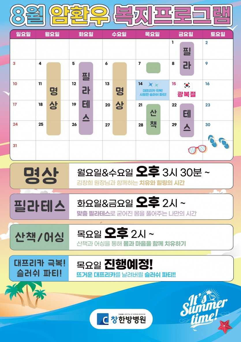 2025년 8월 암환우 복지프로그램 페이지 정보 작성자 창한방병원 조회 875회 작성일 25-07-31 14:14 목록 본문 내용 참고하시어 내원하시는데 불편함이 없으시기 바랍니다 감사합니다! 이전글2025년 8월 진료안내 25.07.31 다음글창한방병원에서 고압산소치료기기 "트리니티" 를 만나보세요 25.07.11