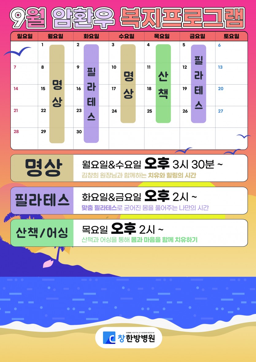 2025년 9월 암환우 복지프로그램 페이지 정보 작성자 창한방병원 조회 718회 작성일 25-09-01 09:22 목록 본문 내용 참고하시어 내원하는데 불편함 없으시기 바랍니다! 암환우분들을 위해 최선을 다하는 창한방병원이 되겠습니다 감사합니다 이전글2025년 추석! 사랑하는 분들에게 내 마음을 표현해보세요 25.09.15 다음글2025년 8월 진료안내 25.07.31