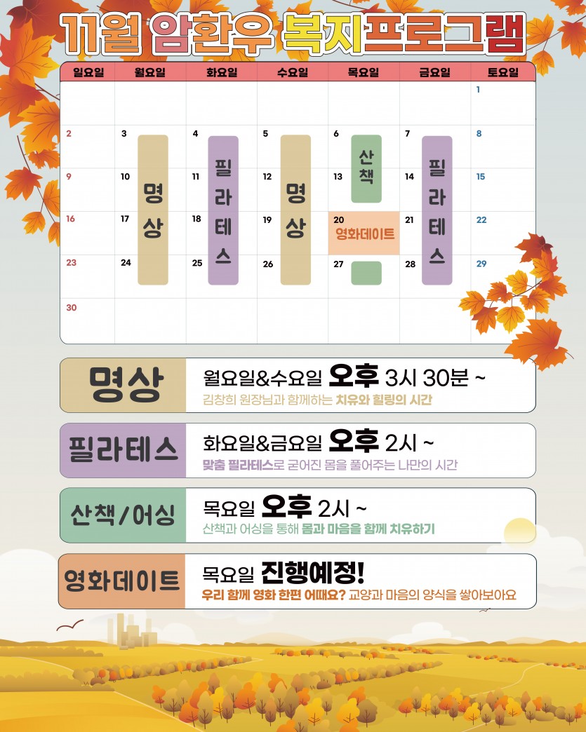 2025년 11월 암환우 복지프로그램 안내 페이지 정보 작성자 창한방병원 조회 293회 작성일 25-10-31 10:34 목록 본문 내용 참고하시어 내원에 불편함이 없으시기 바랍니다 감사합니다 이전글수험자 및 수험자 가족 특별 이벤트 25.11.11 다음글2025년 10월 암환우 복지프로그램 25.09.30