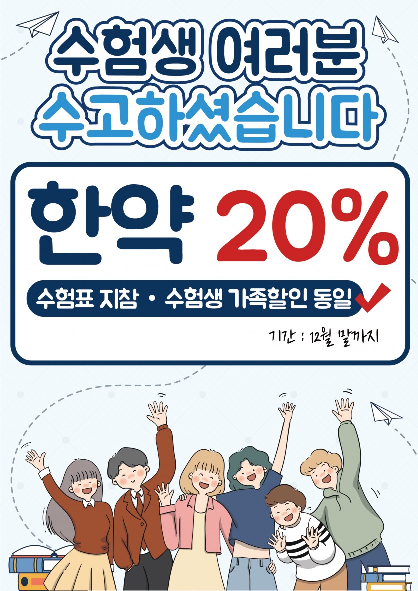 수험자 및 수험자 가족 특별 이벤트 페이지 정보 작성자 창한방병원 조회 194회 작성일 25-11-11 08:50 목록 본문 내용참고하시어 병원이용에 불편함이 없으시기 바랍니다 언제나 환우분들께 감사드립니다 이전글외래진료 예약제 시행 안내 25.11.11 다음글2025년 11월 암환우 복지프로그램 안내 25.10.31