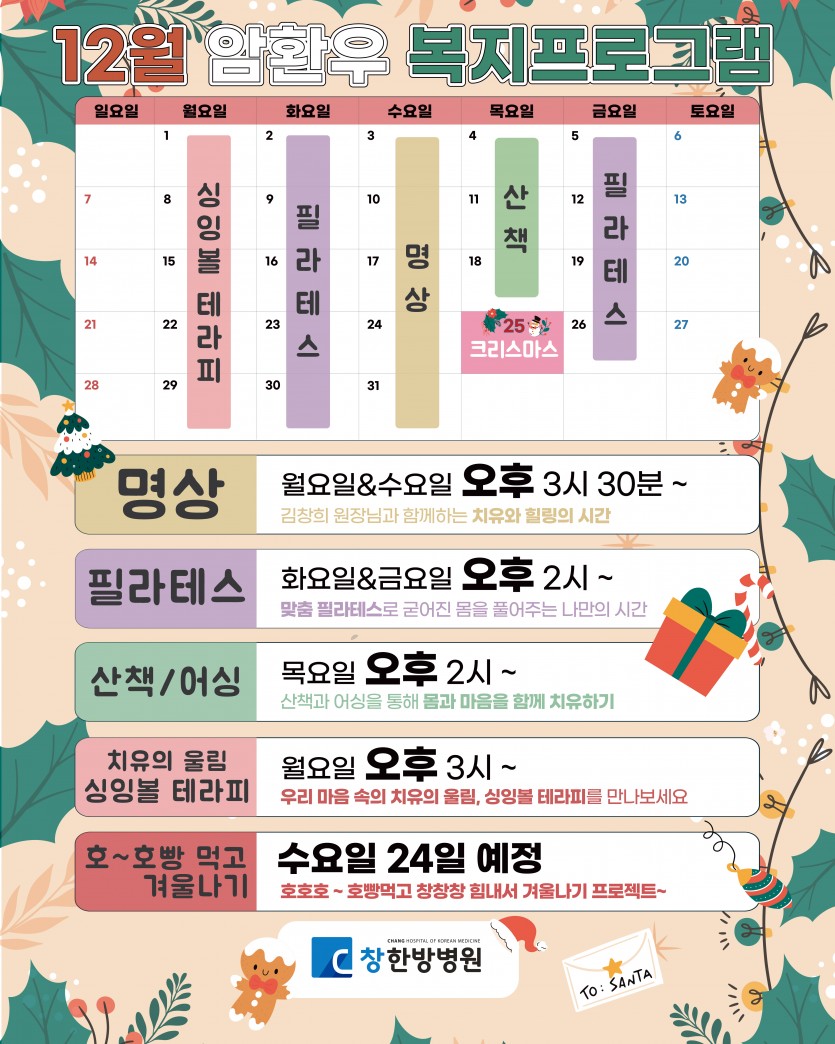 2025년 12월 암환우 복지프로그램 페이지 정보 작성자 창한방병원 조회 19회 작성일 25-11-28 14:11 목록 본문 내용 참고하시어 내원에 불편함이 없으시기 바랍니다 감사합니다 이전글2025년 12월 진료안내 25.11.28 다음글창한방병원 독감주사 백신 4가 진행 중 25.11.28