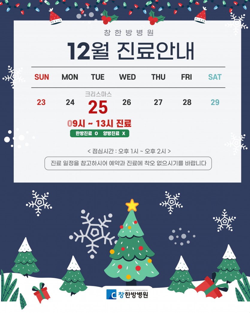 2025년 12월 진료안내 페이지 정보 작성자 창한방병원 조회 18회 작성일 25-11-28 14:38 목록 본문 내용 참고하시어 내원에 불편함이 없으시기 바랍니다 감사합니다 다음글2025년 12월 암환우 복지프로그램 25.11.28