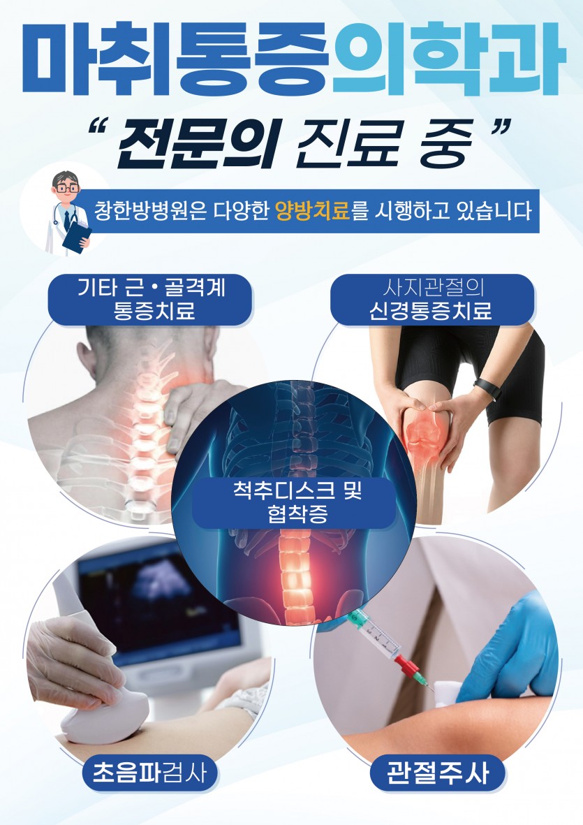 창한방병원에서는 마취통증의학과 전문의의 양방치료를 만나보실 수 있습니다 페이지 정보 작성자 창한방병원 조회 207회 작성일 25-12-18 17:52 목록 본문 내용참고하시어 내원하시는데 불편함이 없으시기 바랍니다 감사합니다 이전글2026년 1월 진료안내 25.12.29 다음글2025년 12월 진료안내 25.11.28